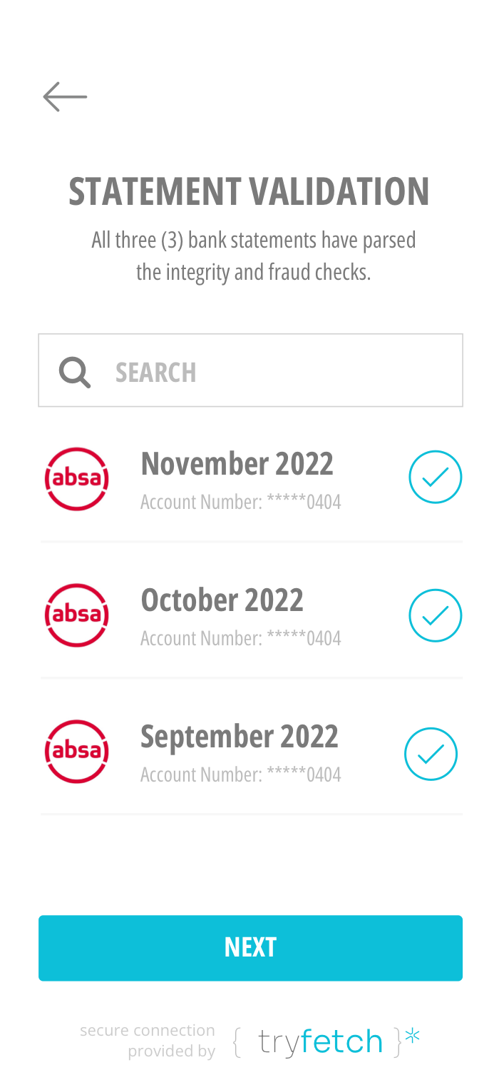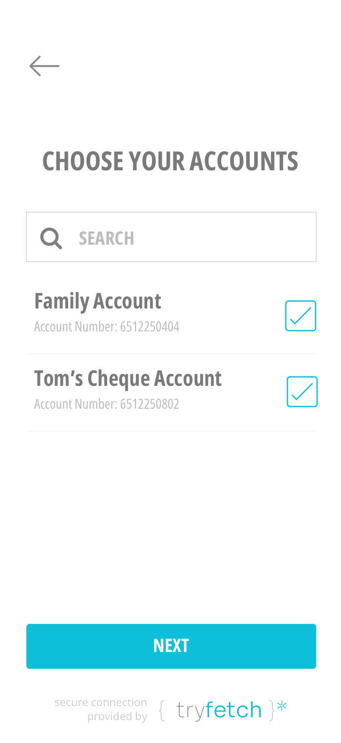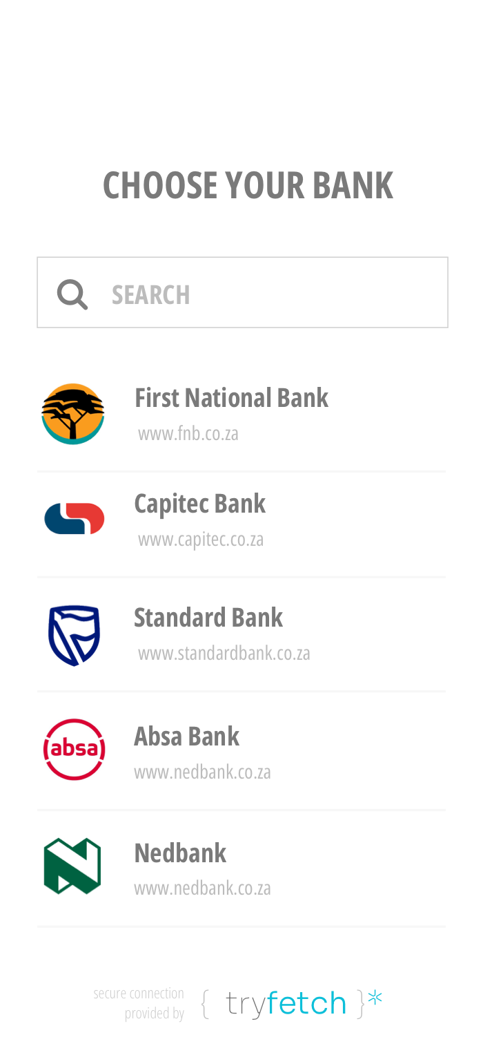 query { fetchTransactions( ... ){ id title account_id currency amount service_fee transaction_date running_balance category { id title } } fetchAccounts( ... ) { id title account_number transactions { id title amount transaction_date } statements { statement_date url mime_type } bank { id title alias branch_code } }}<script src="https://js.connect.tryfetch.me"></script><tryfetch-connect></tryfetch-connect><script> tryfetchConnect('init', { css: 'body{ background: #ffffff; }', events: { onBankConnectSuccess: function(sessionId){ alert('Well done.') } } }</script>Since our first engagement with the tryFetch API’s, we have implemented and never had a problem since. Clean, simple and very easy for developers.